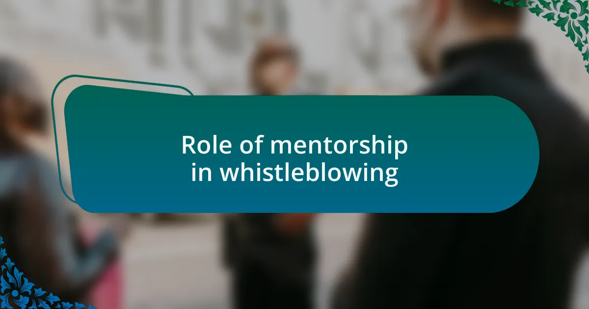 Mentorship plays a critical role in the whistleblowing process, offering guidance to individuals navigating the often daunting landscape of reporting misconduct. I remember one particular mentor who helped me sort through my thoughts when I faced the possibility of blowing the whistle on unethical practices in my workplace. Having someone experienced by my side made the whole process feel less isolating and more empowering, as they shared their insights on both potential outcomes and ways to prepare for the challenges ahead.